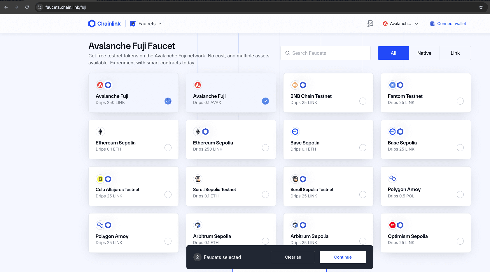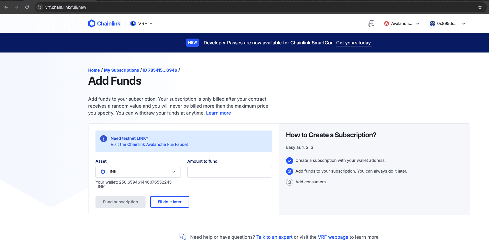 After creating the subscription, you need to fund it with LINK tokens. These tokens are used to pay for the randomness requests made through Chainlink VRF. Make sure your subscription has enough funds to cover your requests. You can get testnet LINK tokens from the Fuji Faucet: Chainlink Faucet for Fuji